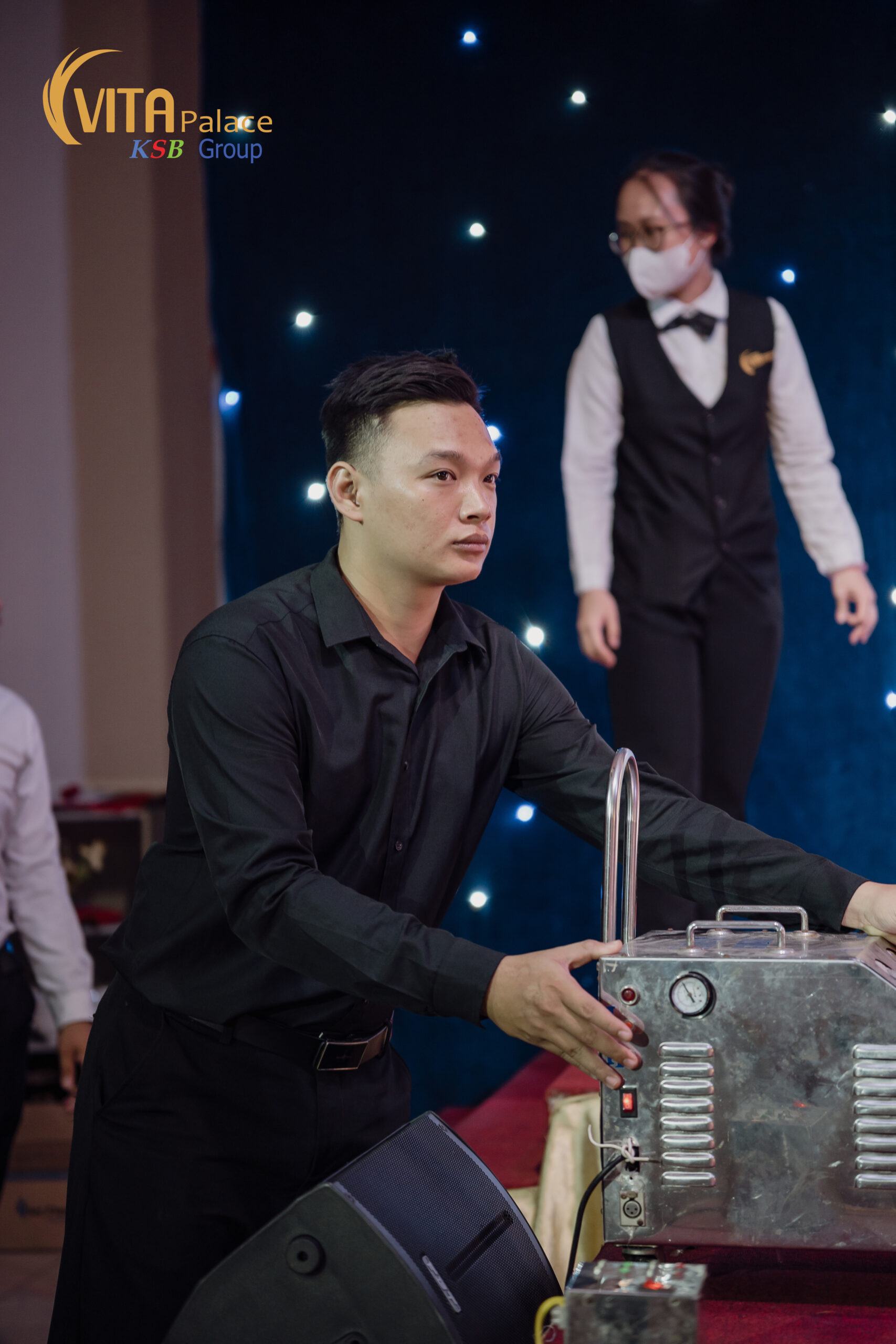 Từ đội stage manager (hậu đài), MC cue line, kỹ thuật ánh sáng đến đội phục vụ đều hoạt động như một đoàn production wedding thực thụ, theo checklist và kiểm soát chất lượng từng phút.